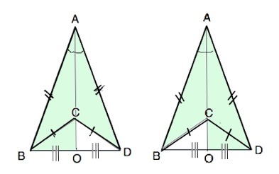 Диагональ АС невыпуклого четырехугольника АВСD, в котором АВ=АD>ВС=СD,разделяет его на 2 треугольника. Прямые АС и ВD пересекаются в точке О. Сравните периметры пятиугольников ВСОDА и DСОВА.