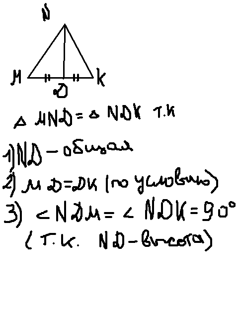 DN — высота треугольника MNK, MD = DK. Докажите, что треугольники MND и KND равны. Сделайте чертёж, приведите подробный ход решения.
