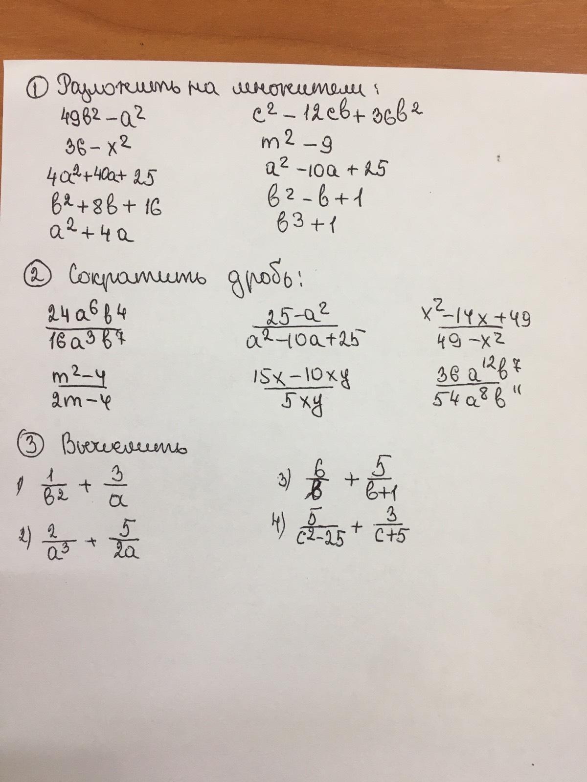1.(7b-a)(7b+a) ,(6+x)(6-x), (2a+5)(2a+5), (b+4)(b+4) ,(с-6b)^2, (m+3)(m-3) ,(a+5)(a+5), (b-1)^2, (b+1)(b^2-b+1)