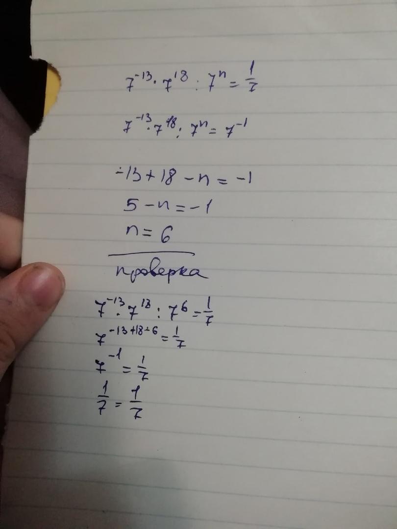 7^(-13 +18 - n) = 7^(-1)