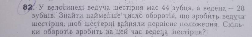 ДАЮ 11 БАЛІВ! У велосипедиста ведуча шестірня має 44 зубця а ведена 20 зубців. Знайти найменше число оборотів, що зробить ведуча шестірня, щоб шестерні зайняли первісне положення. Скільки оборотів зробить за цей час ведена шестірня?