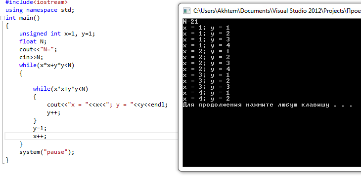 Пользователь вводит натуральное число N; подсчитать количество решений неравен-ства x^2+y^2<N в натуральных числах в С++