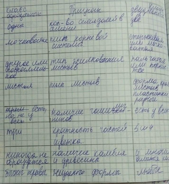 Признак | Класс Однодольные| Класс Двудольные