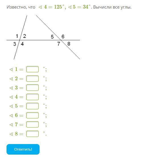 ∠1 = ∠4 = 125° вертикальные углы