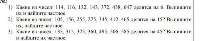 1)114 132 372 438 Частное:19 22 62 73 2) 255 345 465 Частное: 15 23 31 3)135 315 360 495 585 Частное:3 7 8 11 13