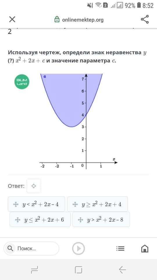 Используя чертеж, определи знак неравенства y (?) x2 + 2x + c и значение параметра c.