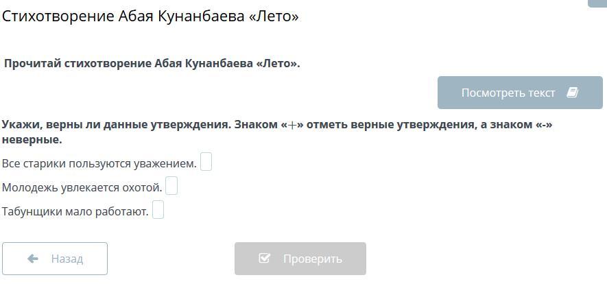 Прочитай стихотворение Абая Кунанбаева «Лето».Укажи, верны ли данные утверждения. Знаком «+» отметь верные утверждения, а знаком «-» неверные.