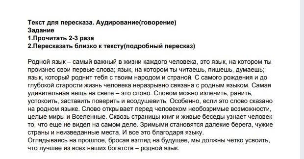 текст для пересказа Аудировоние(говорение) прочитать 2-3 раза пересказать близко к тексту(подробный пересказ)