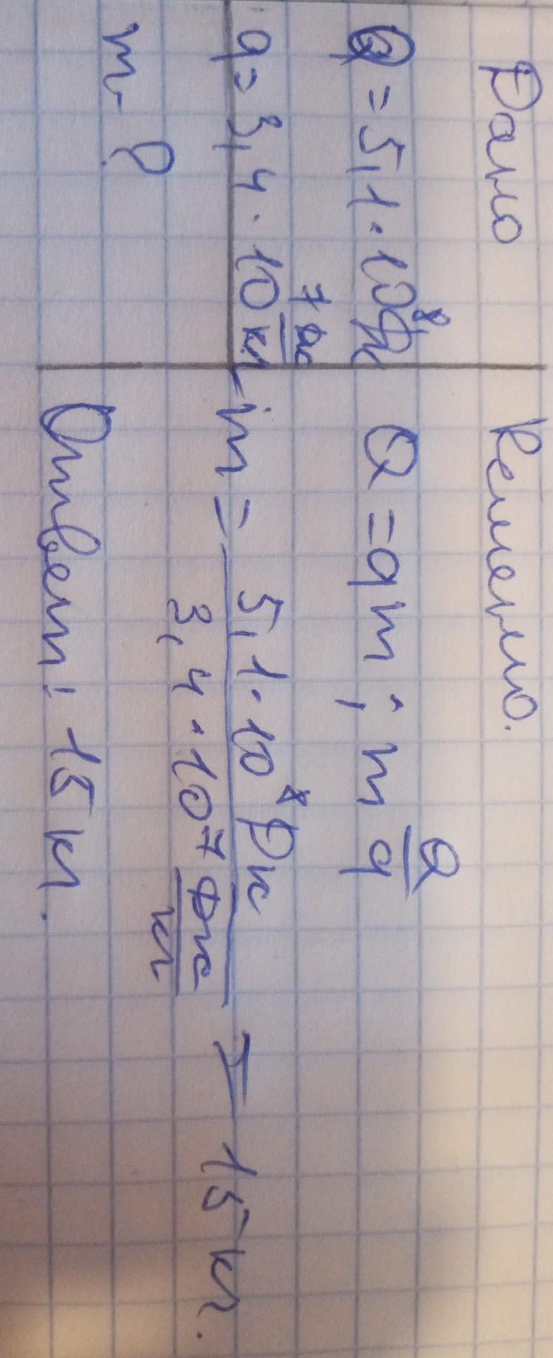 . Определите массу сгоревшего древесного угля, если при его сгорании выделилось 5,1 • 108 Дж энергии