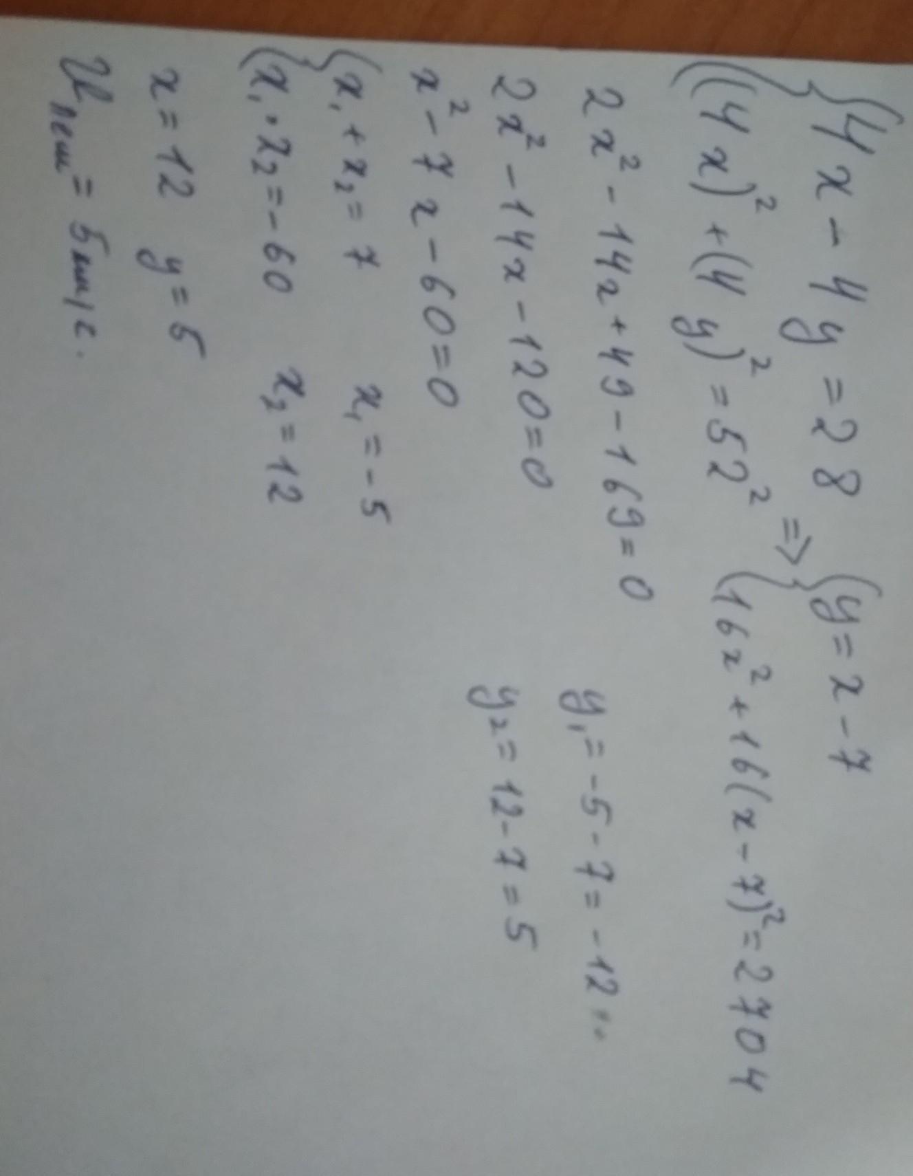 Из одного города одновременно выехал велосипедист и вышел пешеход. Один направился на север, а другой – на восток. Спустя 4 ч расстояние между ними было равно 52 км, причём пешеход прошёл на 28 км меньше. С какой скоростью шёл пешеход?