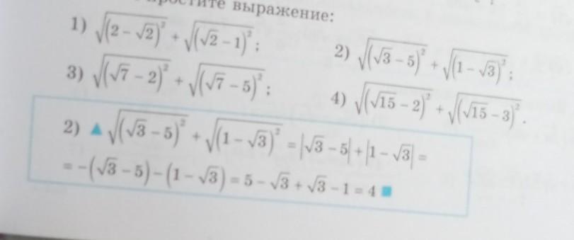 4) \sqrt{(\sqrt{15}-2 )^2}+ \sqrt{(\sqrt{15}-3 )^2} = |\sqrt{15}-2 |+|\sqrt{15}-3 | = -(\sqrt{15}-2 )-(\sqrt{15}-3 ) =