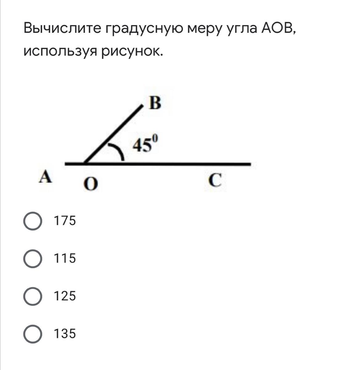 Углы АОВ и ВОС смежные, их сумма 180° по свойству. Т.е. угол АОВ=180-45=135°.
