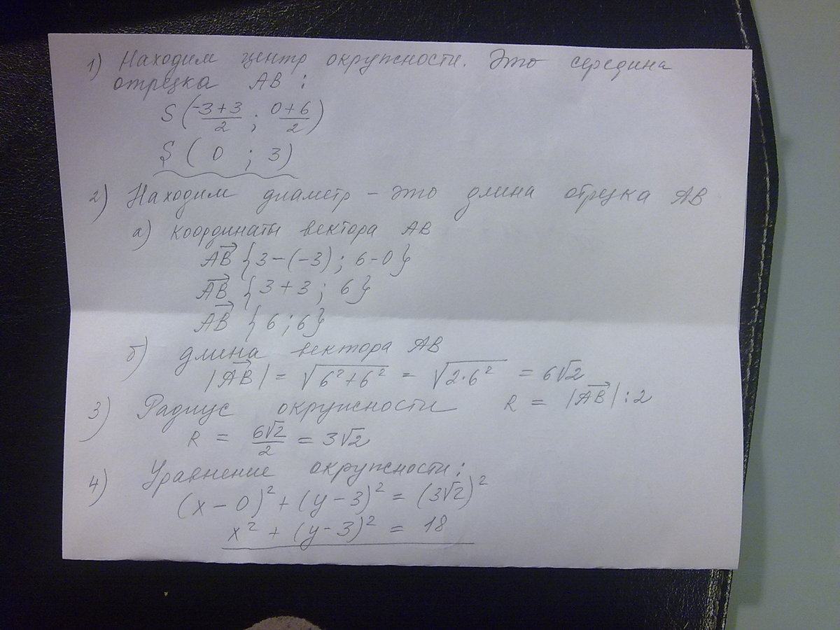 Даны точки А (-3;0) и В (3;6).Написать уравнение окружности, диаметром которой служит отрезок АВ