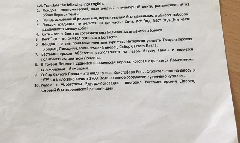 1.4. Translate the following into English: 1. London is an economic, political and cultural center located on both banks of the Thames. 2. The city founded by the Romans was originally small and fenced. 3. London is traditionally divided into three parts: City, East End. West End. These parts differ from each other. 4. The city is the area where most of the offices and banks are concentrated. 5. West End is a symbol of luxury and wealth. 6. London is very attractive for tourists. It is interesting to see Trafalgar Square, Piccadilly, Buckingham Palace, St. Paul's Cathedral. 7. Westminster Abbey is located on the left bank of the Thames and is the political center of London. 8. The Tower of London houses the royal crown, which is guarded by Yeoman Yeoman guards. 9. St Paul's Cathedral is a masterpiece by Sir Christopher Wren. Construction began in 1675. and was completed in 1709. The magnificent structure is crowned with a dome. 10. Near the Abbey, Edward the Confessor built the Palace of Westminster, which was the royal residence.