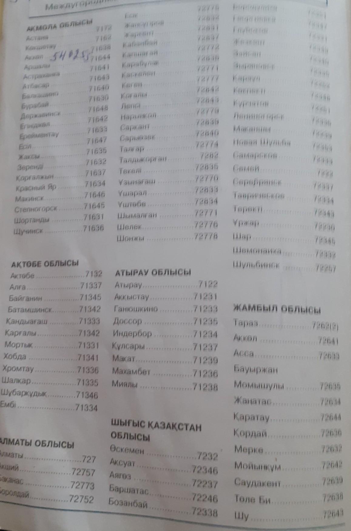 телефон коды бар. Мысалы:Тараз7262(2),Семей7222,Астана7172