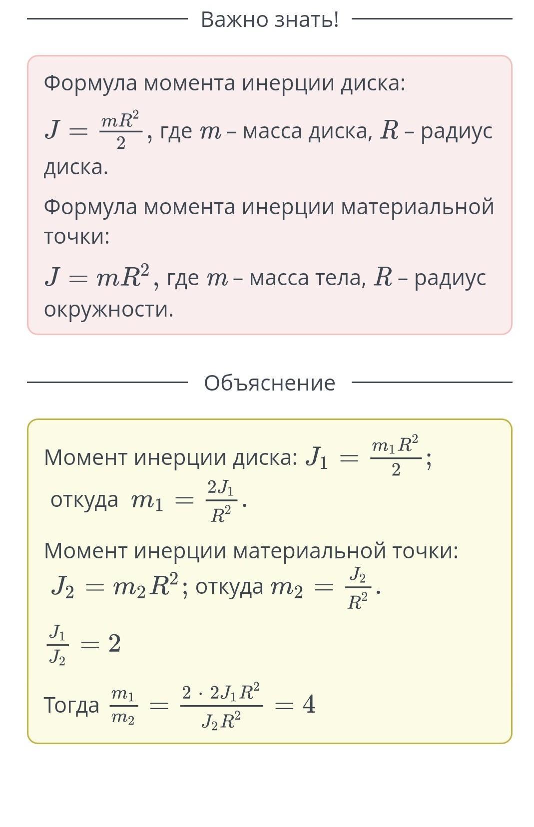 Чему равно отношение масс диска и материальной точки, обращающейся по ободу диска, если отношение их моментов инерции равно 2?