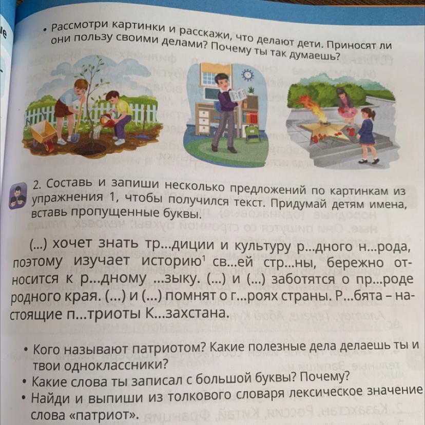 саша хочет знать традиции и культуру родного народа поэтому изучает историю своей страны, бережно относится к родному языку. Сергей и Рустам заботятся о природе родного края. амина и Ирада помнят о героях страны. ребята настоящие патриоты Казахстана