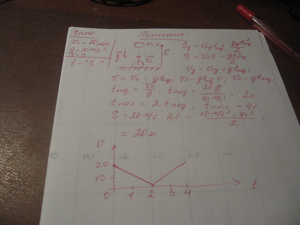 Тело брошено вертикально вверх со скоростью 20 м/с. Начертите график зависимости скорости движения данного тела от времени. Через какое время тело упадет на землю? Какой путь оно при этом пройдет?