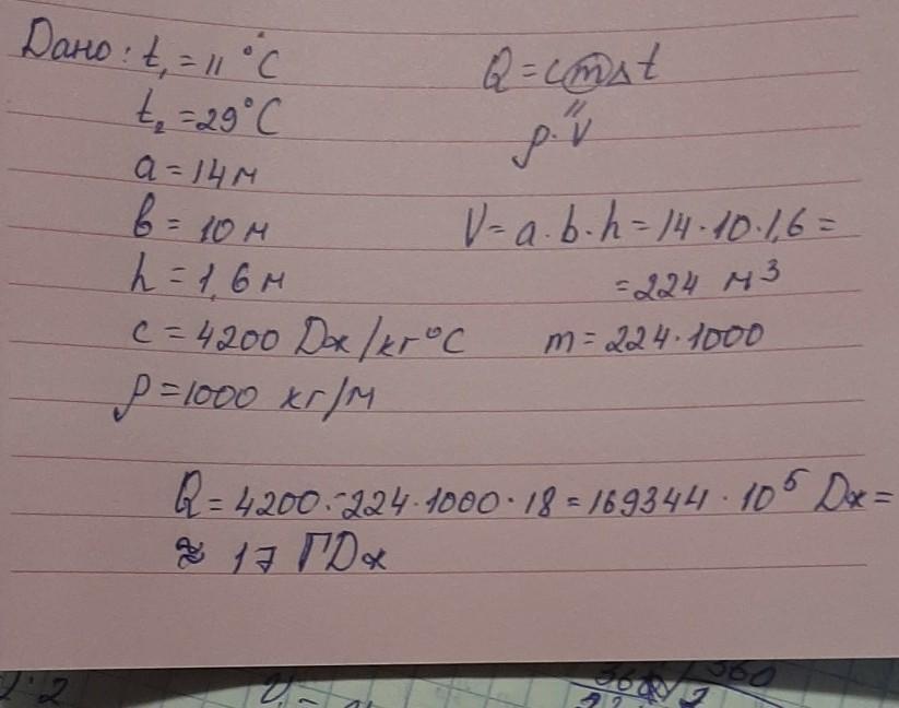 Определи, какое количество теплоты пойдёт на нагревание воды от 11°C до 29°C в бассейне, длина которого — 14 м, ширина — 10 м и глубина — 1,6 м. Удельная теплоёмкость воды равна 4200 Дж/(кг·°C), плотность воды — 1000 кг/м