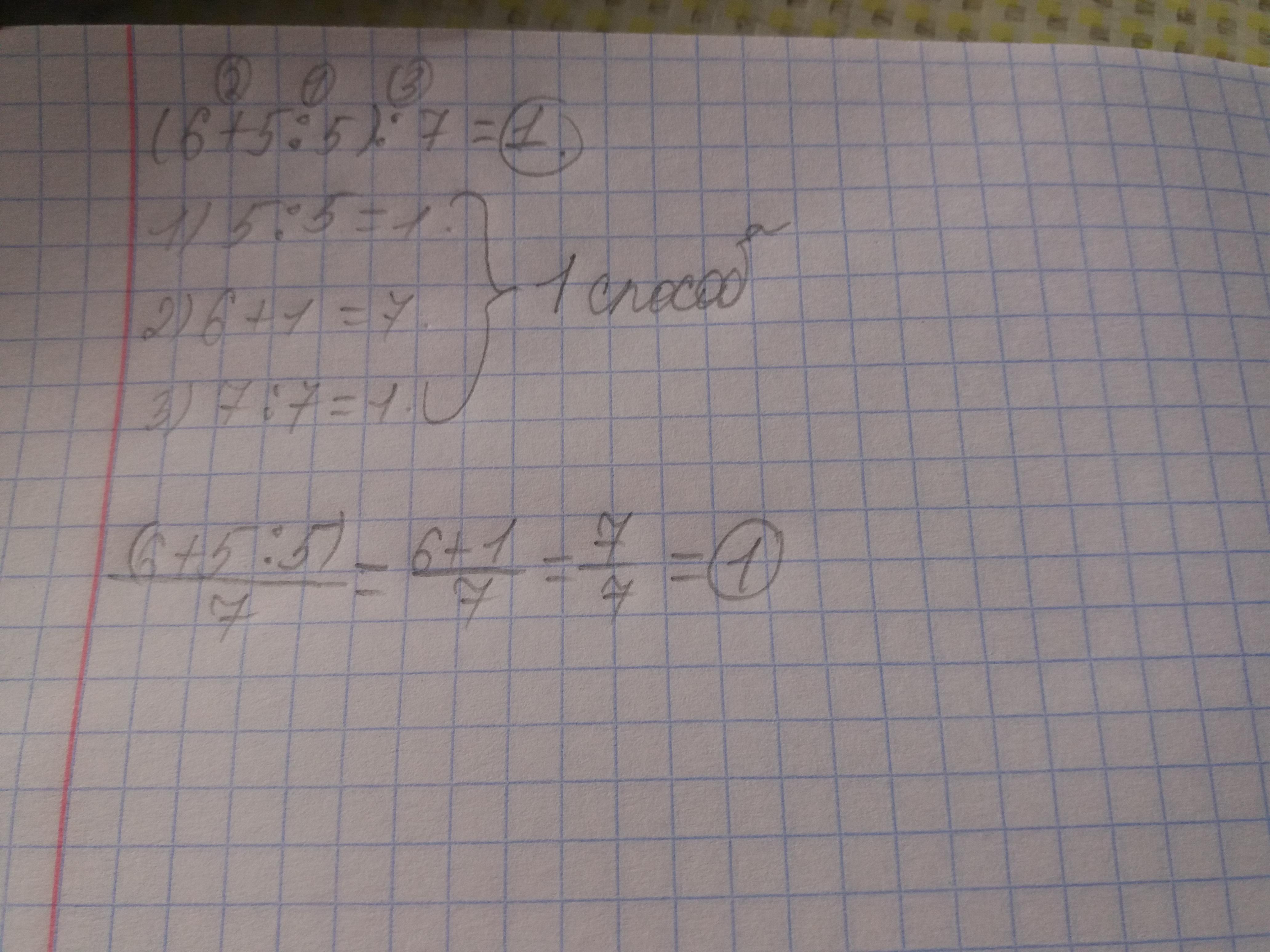 Решаем данное выражение по действиям:сначала решаем л,что в скобках,причём с начало выполняется деление.вторым действием сложение в скобках и третьим действием число,полученное в скобках делится на 7.