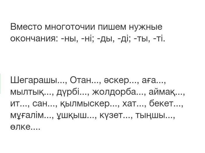 Шегарашыны, Отанды, әскерді, ағаны, мылтықты, дүрбіні, жолдорбаны, аймақты, итті, санды, қылмыскерді, хатты, бекетті, мұғалімді, ұшқышты, күзетті, тыңшыны, өлкені.