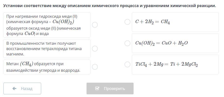 Установи соответствие между описанием химического процесса и уравнением химической реакции.