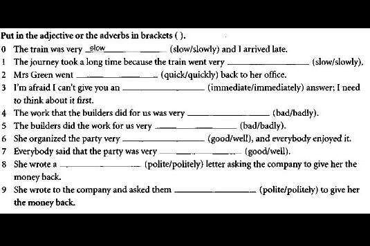 1)slowly 2)quick 3)immediately 4)badly 5)bad 6)good7)weel8)polite9)polite