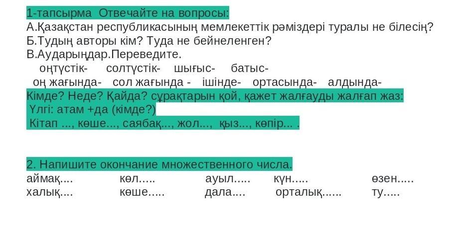 В.Юг-оңтүстік, север-солтүстік,восток-шығыс, запад-батыс,оң жағында-справа,сол жағында-слево, ішінде-внутри,ортасында-посередине,алдында-перед.