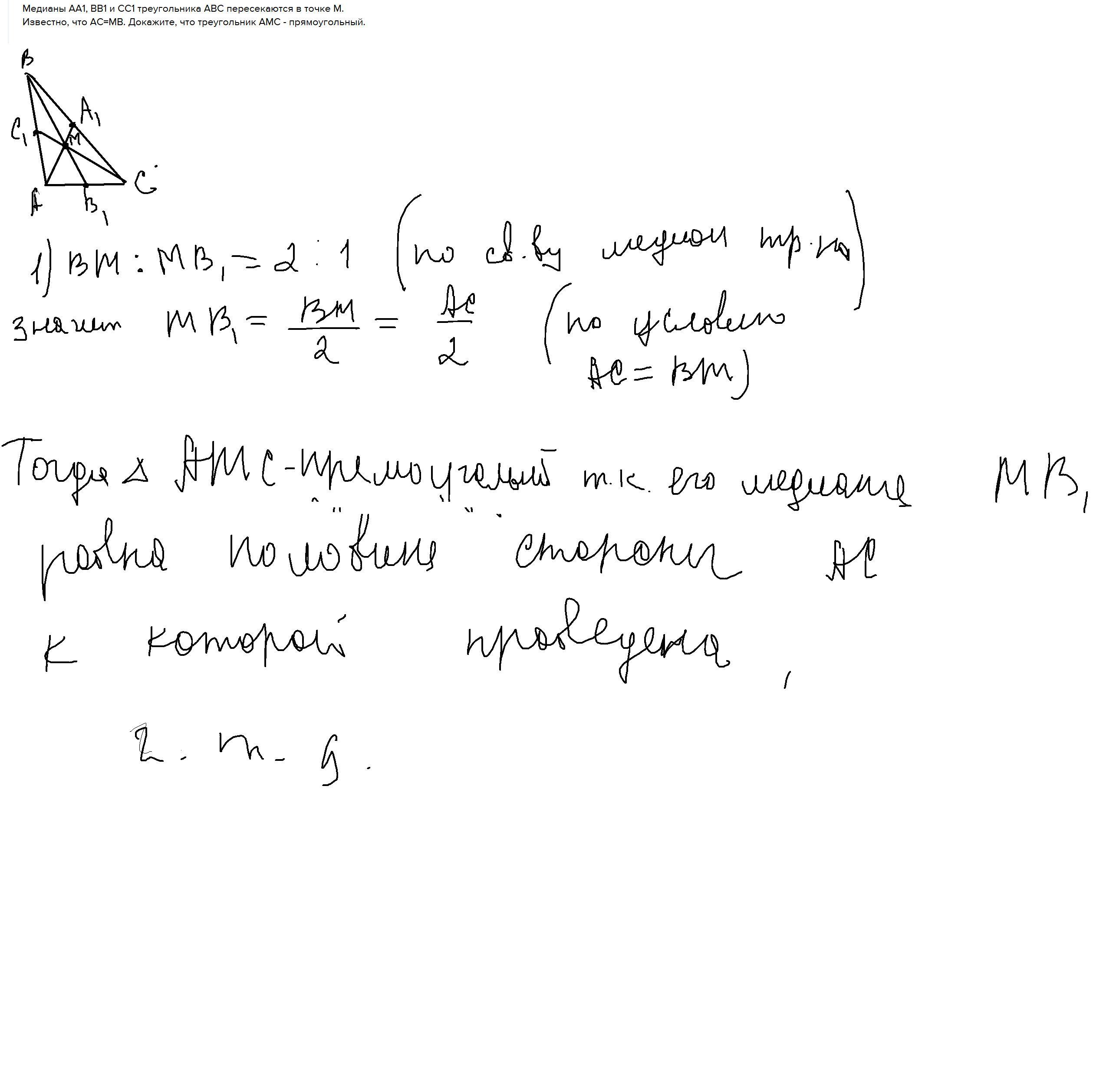 Медианы АА1, ВВ1 и СС1 треугольника АВС пересекаются в точке М. Известно, что АС=МВ. Докажите, что треугольник АМС - прямоугольный.