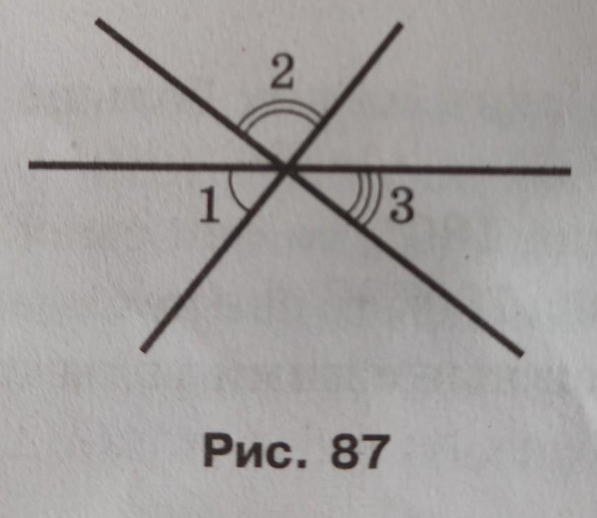 Три прямые пересекаются в одной точке (рис. 87). Найдите сумму угол 1+2+3.