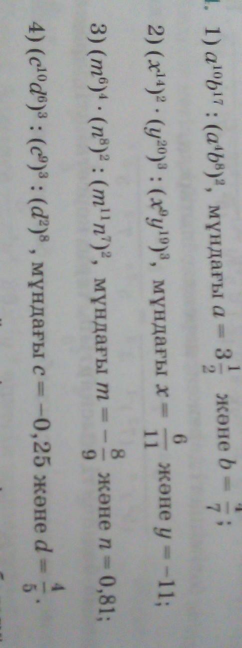 1)a^10b^17 : (a^4b^8)²= a^10b^17 :a^8b^16=a²b ; a=3 1.2 , b=4/7