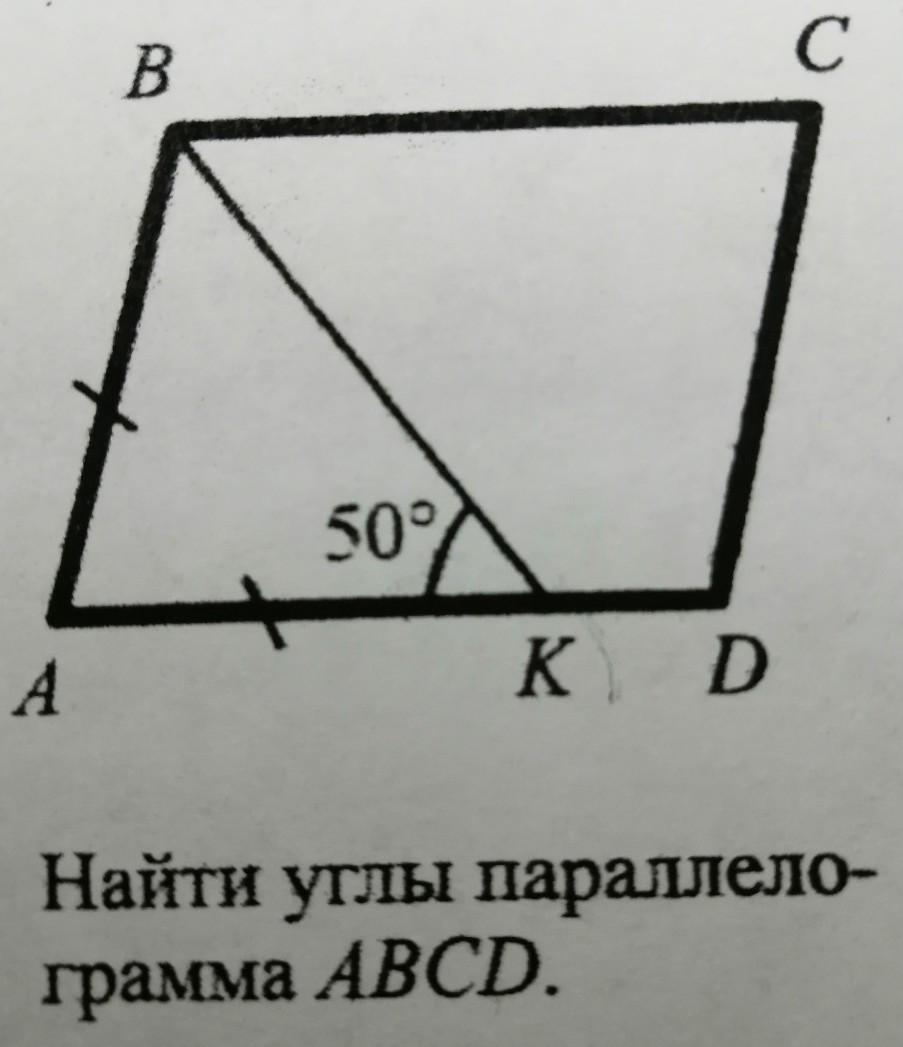 Раз треугольник АВК - равнобедренный, то угол АВК=50°, а угол А=180-(50+50)=80°. У параллелограмма противоположные углы равны, т.е. угол С=80°. Тогда углы В=Д=180-80=100°