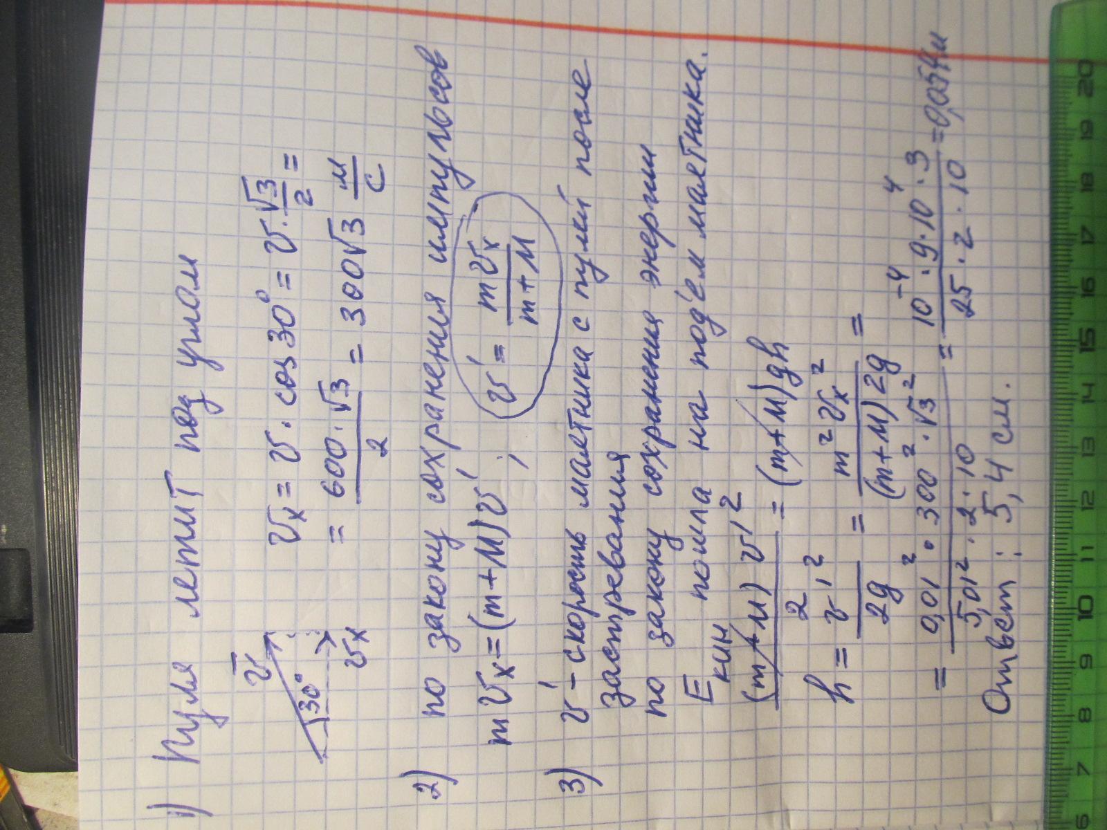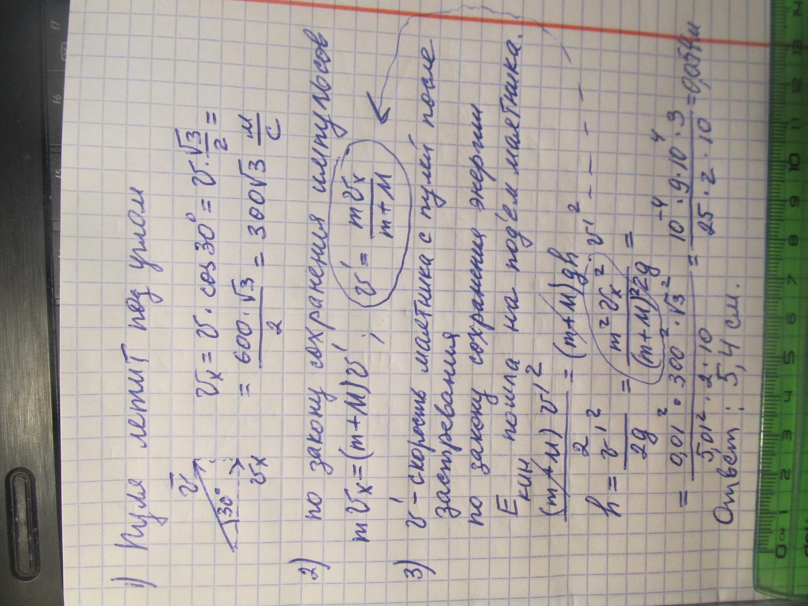 Пуля массой m = 10 г, летевшая со скоростью v = 600 м/c, попала в баллистический маятник массой М = 5 кг под углом 30 градусов к горизонту и застряла в нём. На какую высоту h поднялся маятник, откачнувшись после удара?