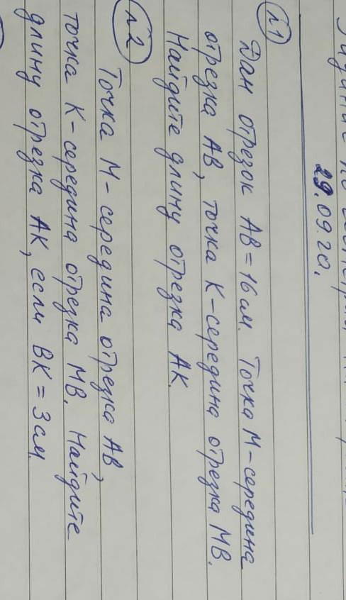 №1 т.к. М-середина АВ, то АМ=МВ=АВ:2 АМ=МВ=16:2=8 см