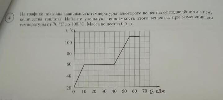 На графике показана зависимость температуры некоторого вещества от подведённого к нему количества теплоты. Найдите удельную теплоёмкость этого вещества при изменении его температуры от 70 C до 100 C. Масса вещества 0,5 кг . ПОМОГИТЕ ПЖ