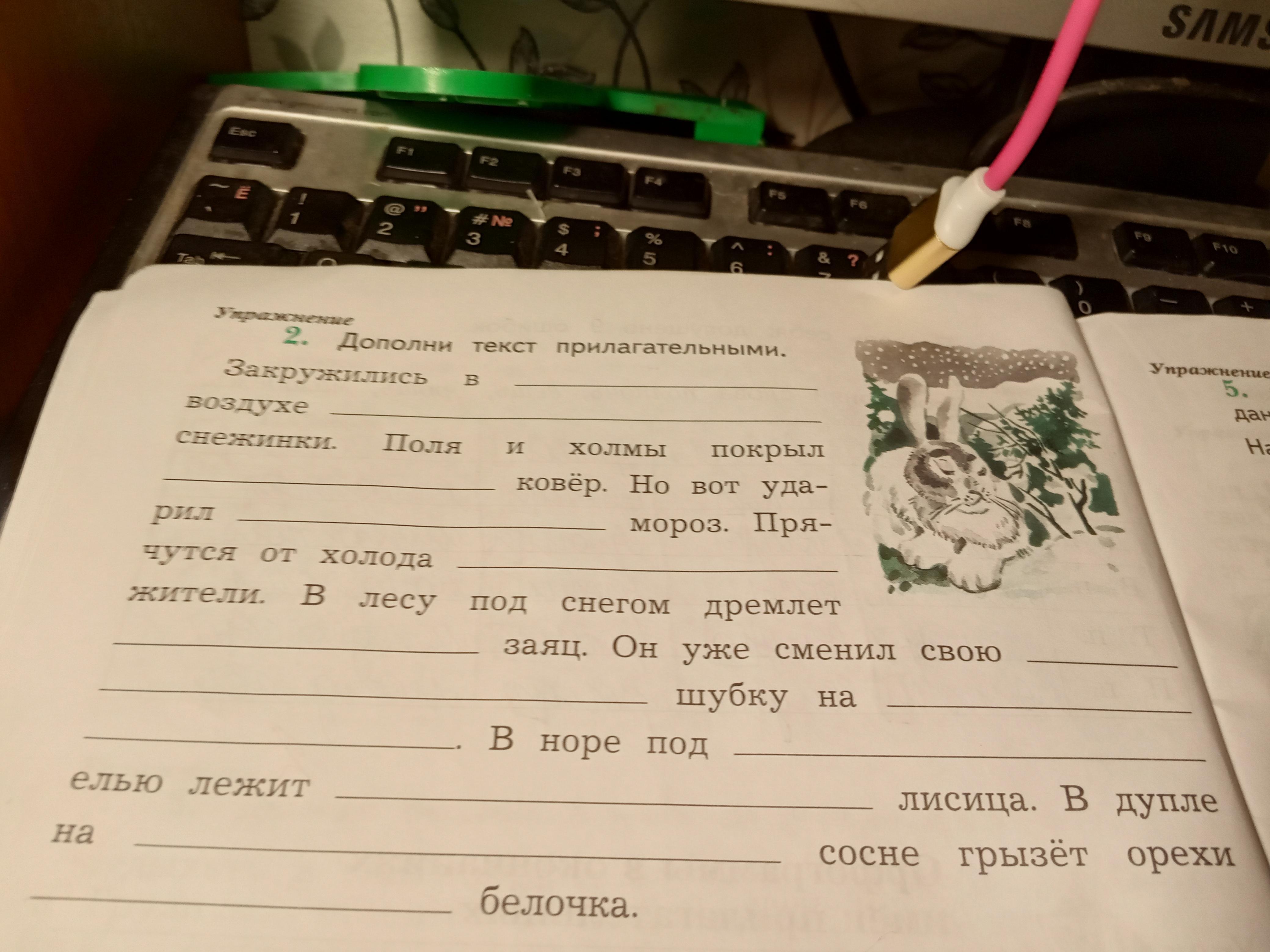 Закружилисьв холодном воздухе мелкие снежинки.Поля и холмы покрыл белый ковер. Но вот ударил ледяной мороз.Прячутся от холода лесные жители. В лесу под снегом дремоет маленький заяц. Он уже сменил свою серую шубку на белую. В норе под елью лежит клубочком лисица. В дупле на высокой сосне грызет орехи рыженькая белочка.