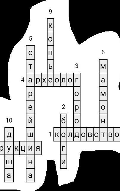 Помогите составить кроссворд со словами:реконструкция,археоло г,копье,мамонт,колдовство,душа,старейшина,боги,город,царь