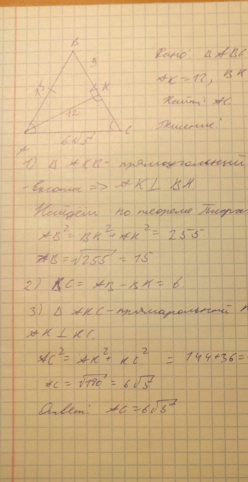 7. Высота AK равнобедренного треугольника ABC (AB = BC) равна 12 см, а KB = 9 см.