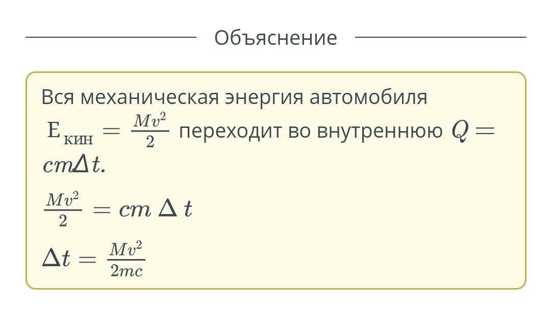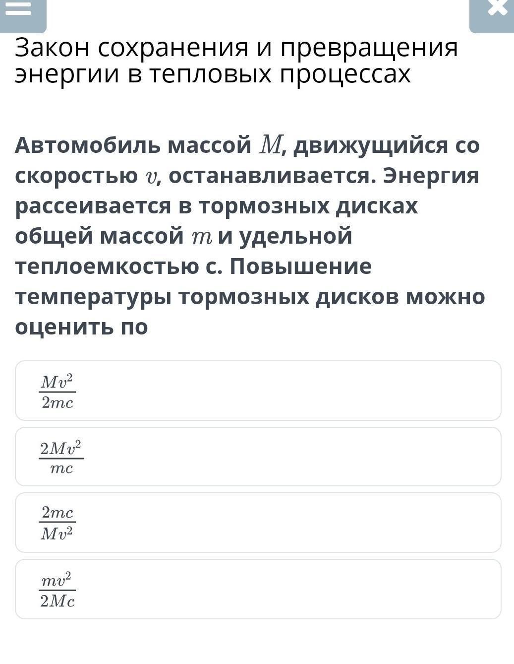 Автомобиль массой M, движущийся со скоростью v, останавливается. Энергия рассеивается в тормозных дисках общей массой m и удельной теплоемкостью с. Повышение температуры тормозных дисков можно оценить по
