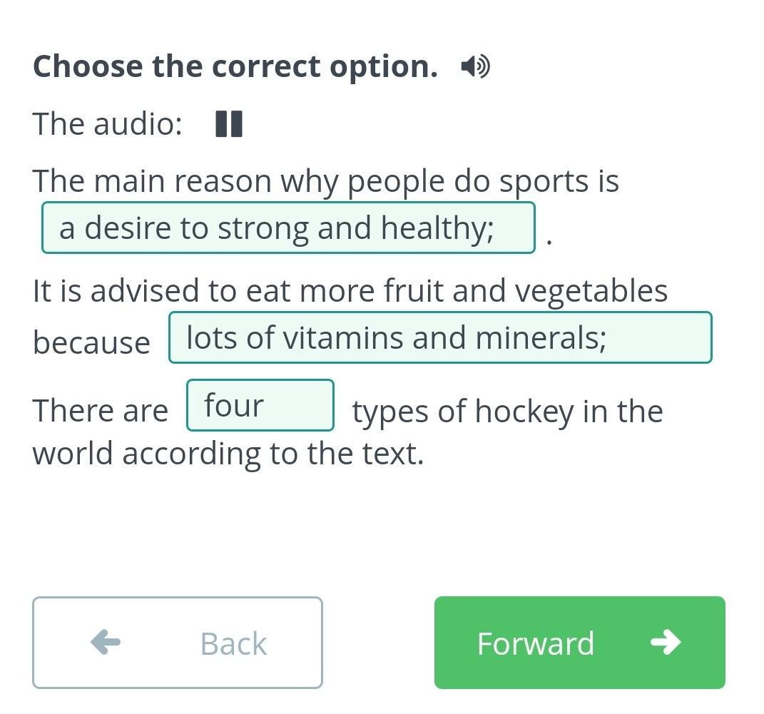 Choose the correct option. The audio: The main reason why people do sports is . It is advised to eat more fruit and vegetables because There are types of hockey in the world according to the text.