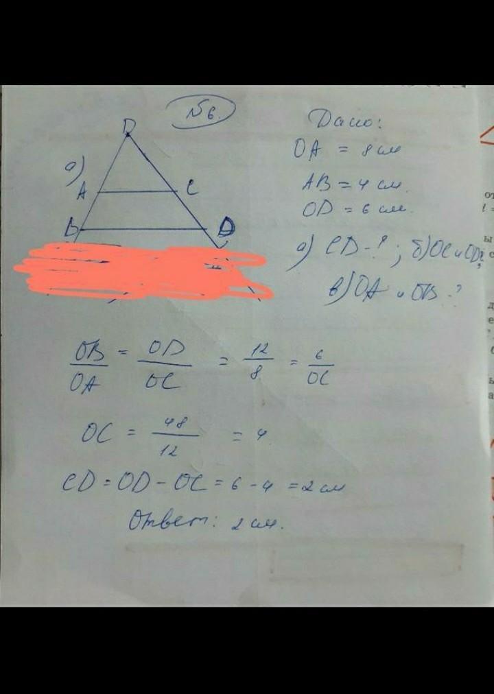 Стороны угла с вершиной О пересечены двумя параллельными прямыми в точках А, В и С, D соответственно. Найдите: a) CD, если OA = = 8 см, АВ = 4 см, OD = 6 см; б) ОС и OD, если OA : ОВ = 3 : 5 и OD - ОС = 8 см; в) OA и ОВ, если ОС : CD = 2 : 3 и OA + ОВ = 14 см.