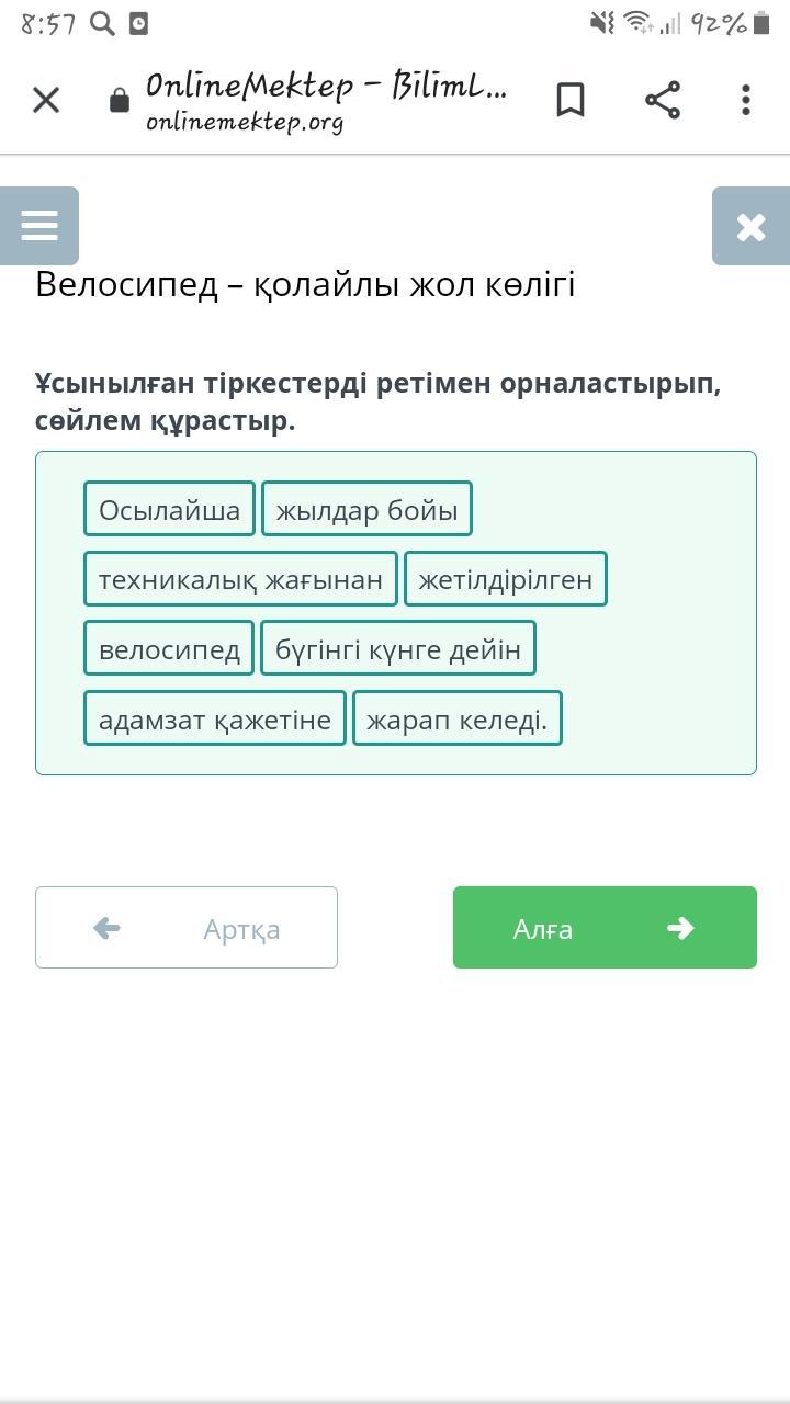 Ұсынылған тіркестерді ретімен орналастырып, сөйлем құрастыр.