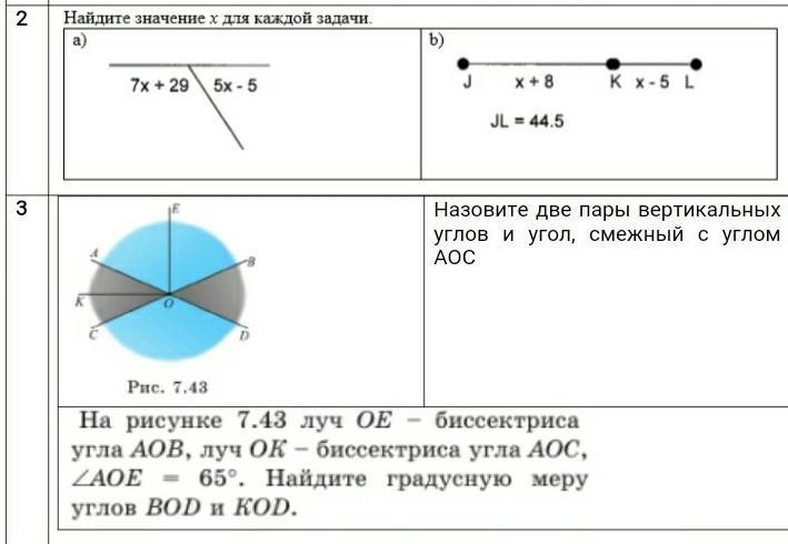 3. вертикальные углы: Угол АОС и угол BOD, угол АОВ и угол COD.