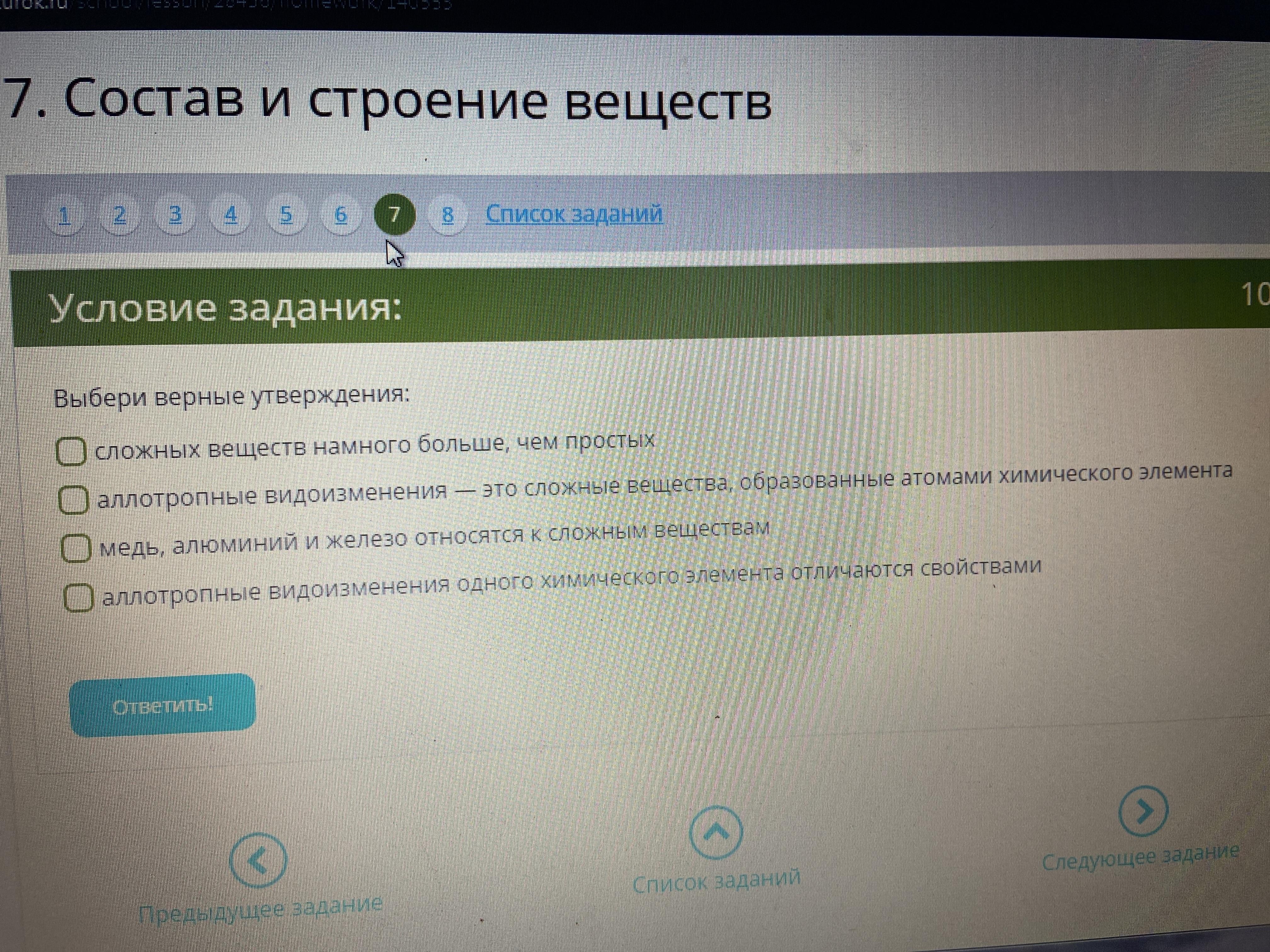 - Аллотропные видоизменения — это сложные вещества, образованные атомами химического элемента — неверно. Аллотропные видоизменения — это простые вещества, которые состоят из одного и того же атома химического элемента, причём их свойства различны.