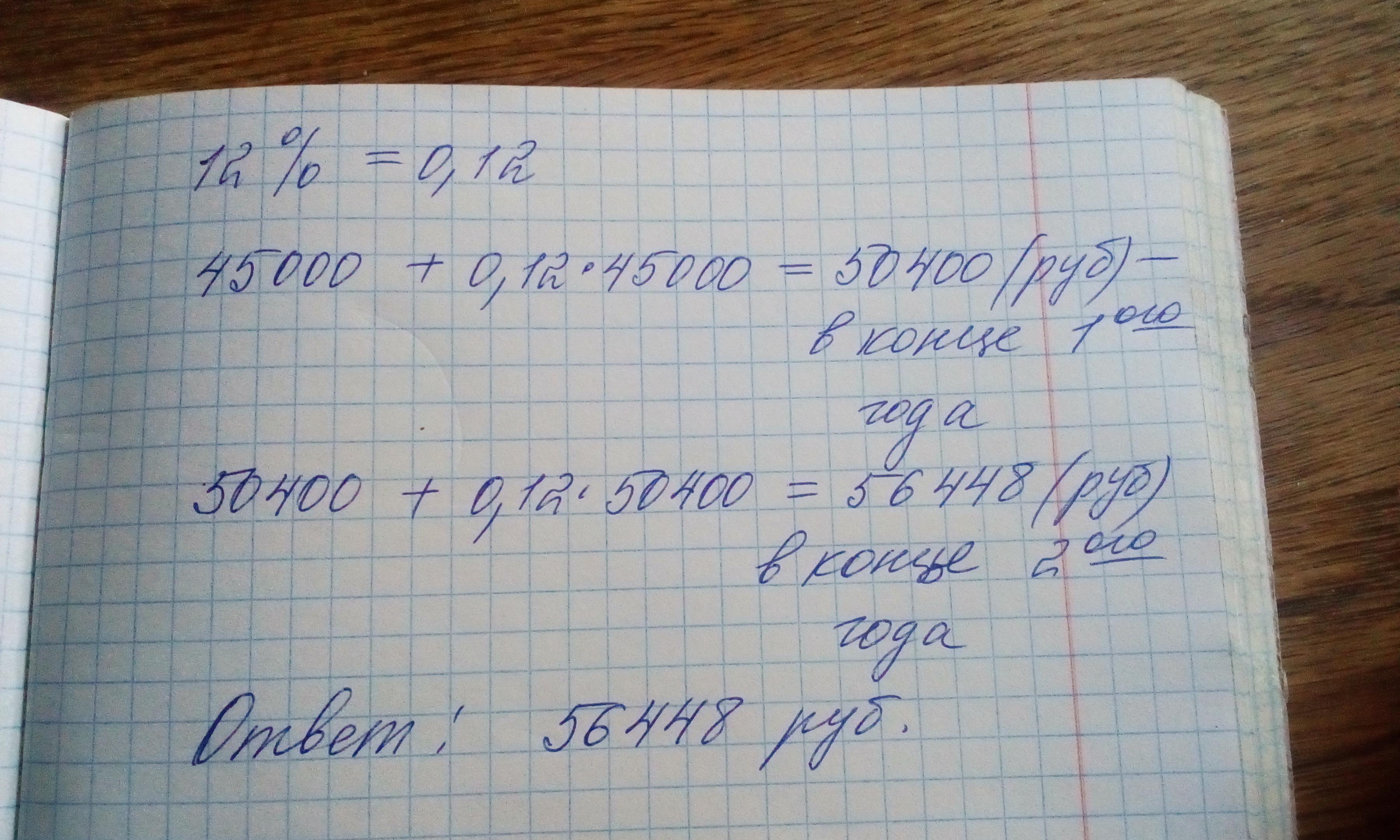 вкладчик положил в январе на счет 45000 рублей в январе следующего года банк начисляет на счет 12 % от суммы, которая была в январе прошедшего года, если в течение года никаких операций с деньгами на счете не проводилось. Сколько рублей будет на этом счете через два года, если никаких операций, кроме начисления процентов, с деньгами на счете проводиться не будет?