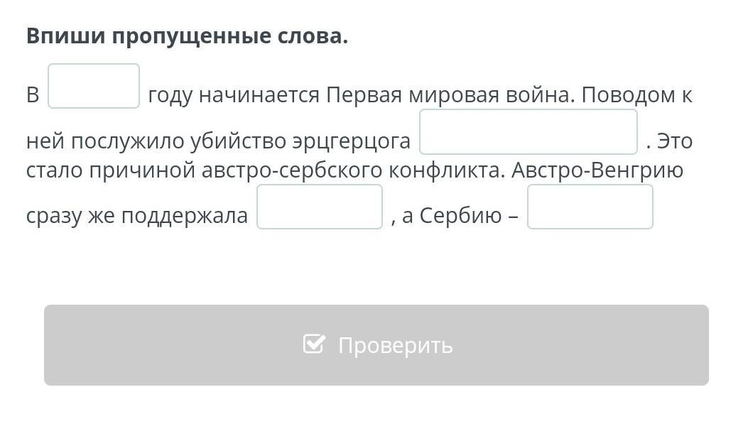 В 1916 году начинается Первая мировая война. Поводом к ней послужило убийство эрцгерцога Франца Фердинанд а (правильно напишите имя, неправильно написала и провалила задание). Это стало причиной австро-сербского конфликта. Австро-Венгрию сразу же поддержала Германия , а Сербию – Россия.
