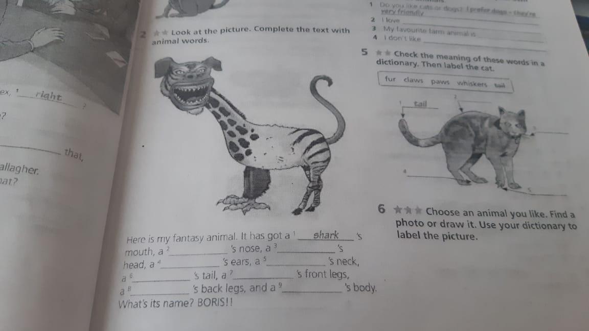 In the picture, I see an unusual animal. He has a head like a tiger, a neck like a giraffe and a body like a zebra. His front legs are chicken, and the tail is rat.
