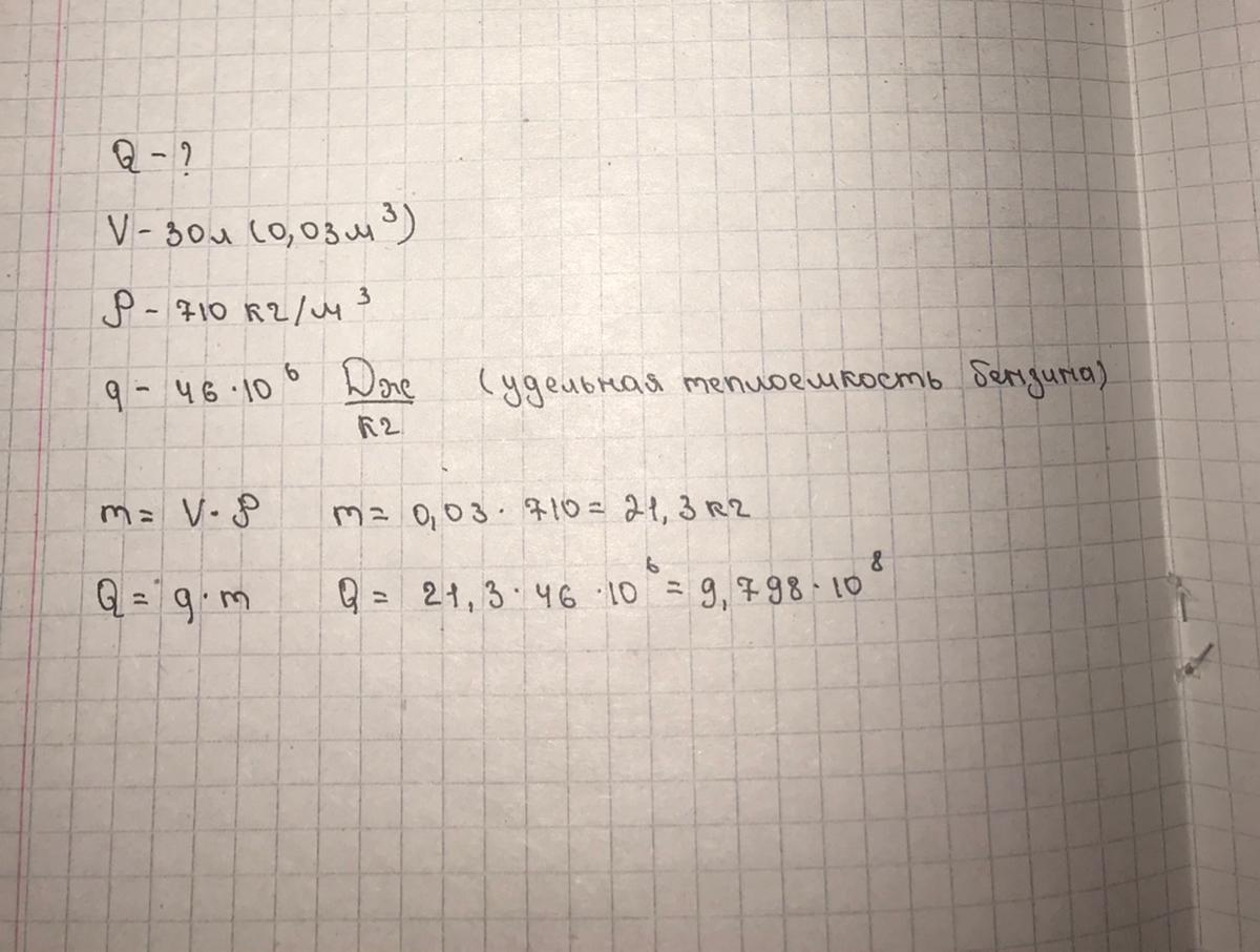 30 баллов Какое количество теплоты можно получить при полном сжигании 30 литров бензина? Плотность бензина 710 кг/м3.