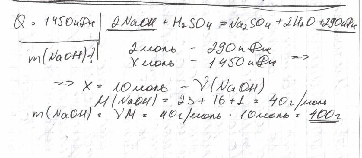 вычислите массу гидроксида натрия, вступившего в реакцию, если известно, что при его нейтрализации выделилось 1450 кДж теплоты.