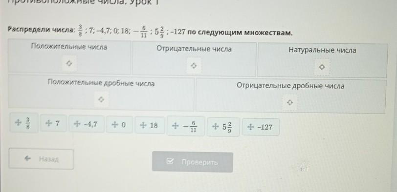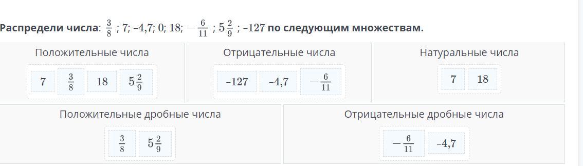 Распредели числа: 3; 7; -4,7; 0; 18; –:54: -127 по следующим множествам.
